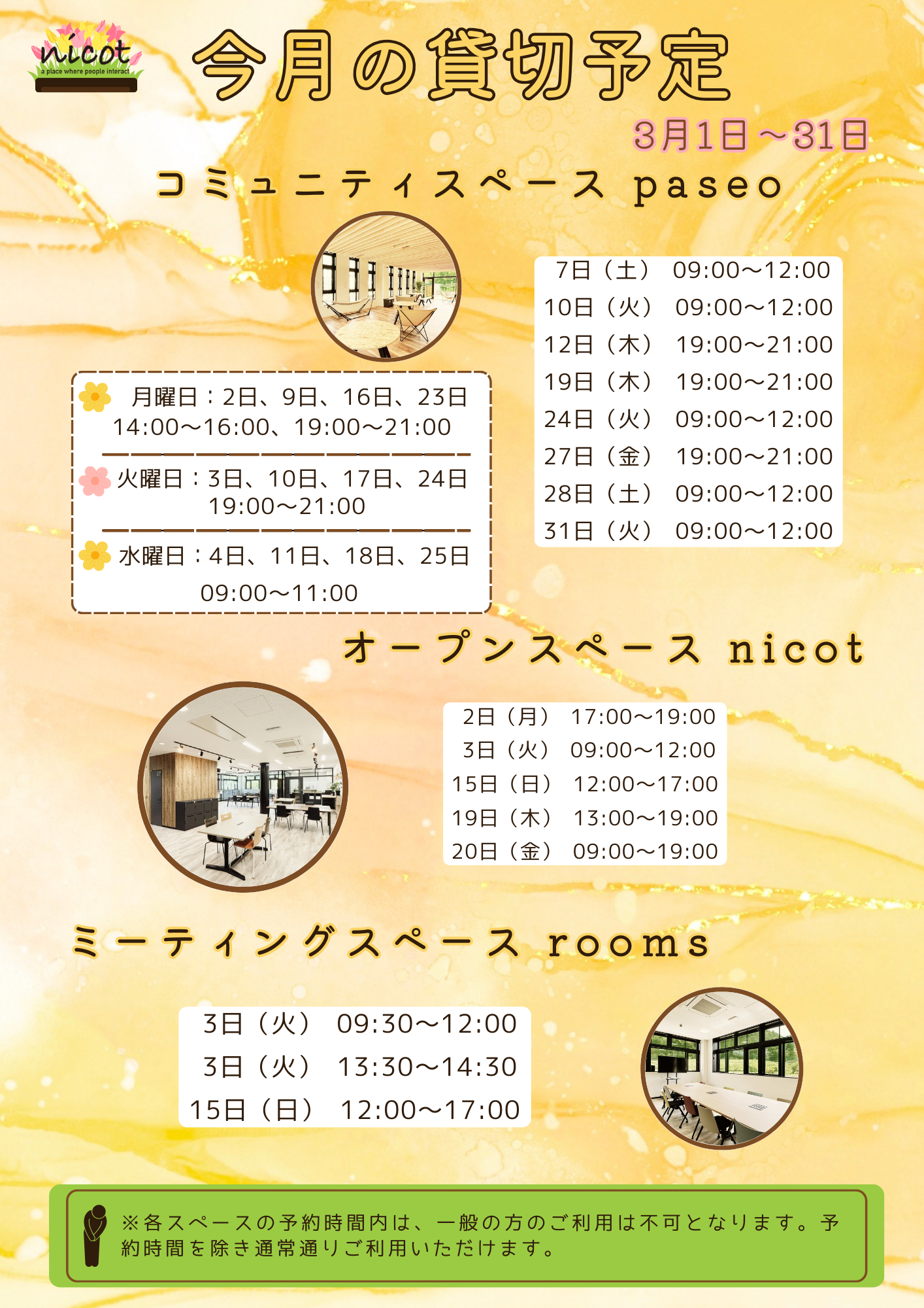 ※3月もコミュニティスペースpaseoに、定期の貸切が月曜日・火曜日・水曜日で入っております。ご予約時間内は、一般の方はご利用いただけませんので、ご了承ください。